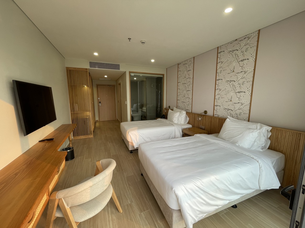 Phòng có diện tích 36m2, có 1 giường đơn và 01 giường lớn,phòng có cửa số hướng trực diện biển. Phòng có trang thiết bị nội thất hiện đạt đạt tiêu chuẩn 4 sao đảm bảo chất lượng tốt nhất cho du khách về nghỉ ngơi ở Thiên Cầm. Hạng phòng Deluxe Ocean View mở ra tầm nhìn thoáng đãng về biển Thiên Cầm. Với hệ thống trang thiết bị nội thất hiện đại, đầy đủ tiện nghi, kết hợp cùng lối trang trí nhẹ nhàng và tinh tế. Đây chính là sự lựa chọn lý tưởng cho Du khách đang tìm kiếm trải nghiệm thanh bình và tĩnh lặng bên “Cung đàn biển”.