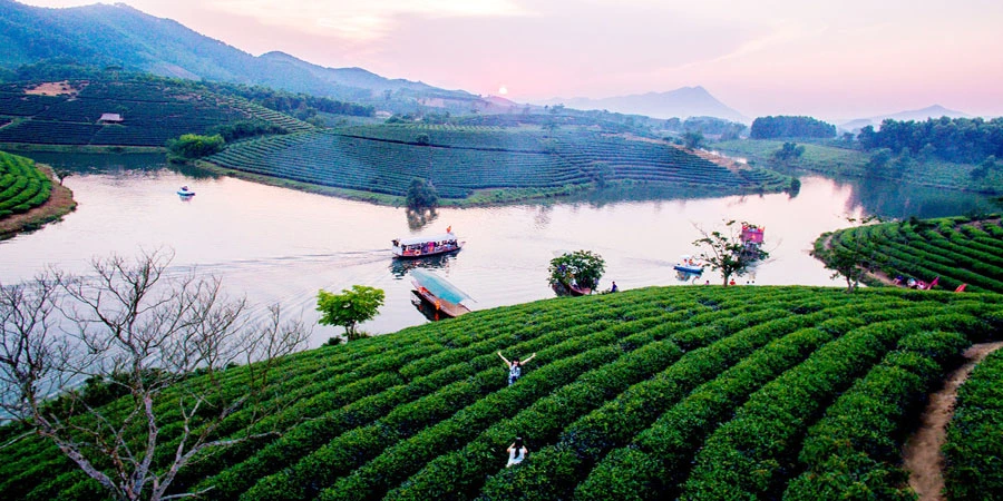 ✨ Cảm giác trải nghiệm: Ngồi trên chiếc thuyền máy nhỏ, lướt nhẹ trên mặt nước, bạn sẽ cảm nhận được hơi nước mát lạnh quện với mùi thơm thanh khiết của lá chè non nồng nàn trong cánh mũi.